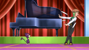 火箭隊三人組為了竊取純金獎品,讓喵喵偽裝成「雙刃丸」參賽,並利用科技遙控裝置與強化塑料扇貝貝在比賽中作弊。然而,在表演賽環節中,偽裝成雙刃丸的喵喵因為扇貝貝飛走而露餡,身份揭穿後,火箭隊試圖武力奪取金扇貝貝,最終被皮卡丘的十萬伏特擊飛,結束了這場鬧劇。