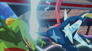 超級蜥蜴王利用「瘋狂植物」和「龍之爪」建立起強大的攻勢,試圖拉開距離進行消耗戰。但小智與甲賀忍蛙的精神高度同步,展現出驚人的速度與力量。在戰鬥的高潮,甲賀忍蛙在身後匯集了巨大的橙色「水之手裏劍」,正面突破了超級蜥蜴王的絕招,並給予致命一擊。最終,小智獲得勝利,成功晉級卡洛斯聯盟決賽。賽後,兩人互相激勵,翔太承諾會變得更強,而小智則準備在決賽與阿嵐一決高下。