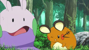 咚咚鼠憑藉著偵測電波的能力,率先找到了躲在岩石深處的黏黏寶。此時火箭隊也追了上來,面對武藏強大的攻擊,咚咚鼠為了保護身後動彈不得的黏黏寶,不顧體型差距與傷勢,拼命使出撞擊與臉頰揉揉進行反擊。黏黏寶被咚咚鼠捨身保護自己的勇氣深深打動,在關鍵時刻克服恐懼,使出求雨干擾火箭隊。隨後,小智與希特隆靠著火箭雀的引導及時趕到,合力將火箭隊擊飛。