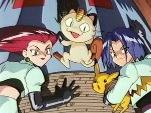 火箭隊(武藏、小次郎與喵喵)再次現身,他們先是用變聲裝置企圖誘捕皮卡丘未果,隨後轉往喇叭芽之塔展開大規模行動。他們利用雙彈瓦斯的煙幕在塔內製造火災假象,疏散了所有學生並佔領塔樓。火箭隊威脅小智,若不交出皮卡丘就要炸毀這座城市的象徵——喇叭芽之塔。為了確保古蹟安全,小智無奈之下只能讓皮卡丘暫時交給對方。火箭隊為了應對皮卡丘的電擊,甚至準備了特製的絕緣橡膠手套,成功制伏了皮卡丘並打算搭乘手動火箭逃走。