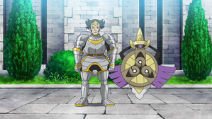 修煉完成後,雁鎧對兩人的表現讚譽有加,並授予他們「騎士勳章」。雁鎧觀察到飛天螳螂已經具備了進化的特質,便贈予小豪「金屬膜」。在場館的協助下,飛天螳螂成功進化為巨鉗螳螂。小智與大蔥鴨不僅提升了戰鬥實力,更深刻理解了騎士道中守護他人的溫柔精神,帶著滿滿的成長結束了這次的卡洛斯特訓之旅。