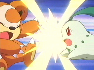 小智一行人在寶可夢中心向喬伊小姐詢問,得知這隻熊寶寶確實是當地的頭號麻煩人物。為了拿回被偷走的背包,小智在喬伊小姐的引導下找到了熊寶寶的藏身處。雙方展開對戰,小智派出受委屈的菊草葉應戰。熊寶寶展現出強大的實力,連續使用「高速星星」與「影子分身」,但菊草葉在小智的指揮下保持冷靜,以「飛葉快刀」精確擊中本體獲得勝利。正當大家準備拿回背包時,熊寶寶突然發出光芒,進化成了體型巨大且面目猙獰的「圈圈熊」。