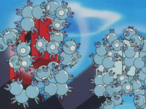 面對數量龐大的臭泥大軍,小智原本想讓皮卡丘迎戰,但數量實在過多。關鍵時刻,之前那隻小磁怪帶著一群夥伴和進化形「三合一磁怪」及時現身支援。在小磁怪與三合一磁怪強大的電擊攻勢下,臭泥大軍被趕回大海。最後剩下強悍的臭臭泥首領,在皮卡丘與小磁怪的合力電擊下終於倒下,小智趁機投擲精靈球,成功收服了臭臭泥。隨著海水進水口疏通,發電廠恢復運作,城市也重獲光明。