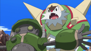 正當陷入僵局時,火箭隊突然現身企圖搶走皮卡丘與布里卡隆。混戰中,洛本為了保護地上的種子,遭到火箭隊的攻擊而嚴重損毀並停機。目睹好友受傷的布里卡隆憤怒爆發,展現強大力量配合小智等人的寶可夢將火箭隊擊飛。事後,希特隆通宵達旦進行修理,堅信科學不應在放棄的那一刻停止,最終成功讓洛本重新啟動。令人驚喜的是,洛本內建了市谷老師留下的「岩石除去迴路」,它發揮出超乎預期的力量粉碎了岩盤,清澈的水源終於噴湧而出,枯萎的大地重新獲得了生機。