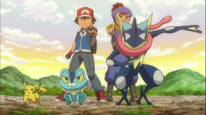 在戰鬥過程中,龜足巨鎧展現出強大的壓制力,使皮卡丘與甲賀忍蛙一度陷入苦戰。就在千鈞一髮之際,小智的呱呱泡蛙展現出保護同伴的強烈意志,成功進化為「呱呱赤顎」,並領悟了新招式「燕返」。憑藉著進化的力量與靈活的動作,呱呱赤顎成功扭轉戰局。面具忍者隨後撤退,引導眾人進入宅邸。最終真相大白,原來面具忍者的真面目正是三平的師父才藏,這場襲擊其實是為了測試三平在修行旅途中的成長與羈絆而設下的考驗。三平雖然送達的是卷白紙,但他展現出的勇氣獲得了認可。最後,小智與進化後的呱呱赤顎,與三平相約進行一場更高水準的對戰。