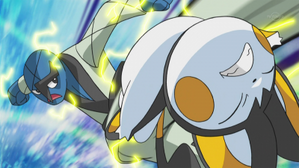東喬治對戰進入準決賽的尾聲,小智派出藍蟾蜍擊敗了對手的火紅不倒翁,率先取得決賽門票。緊接著進行的是準決賽第二場,由艾莉絲對上路克。艾莉絲決定讓從未在正式大賽上場的牙牙出道,而路克則派出泥偶小人迎戰。由於泥偶小人具有幽靈屬性,牙牙的普通屬性招式「抓」完全無效,陷入了苦戰。在危急時刻,牙牙在戰鬥中意外學會了強大招式「逆鱗」,成功擊敗泥偶小人,讓艾莉絲順利晉級決賽與小智會師。