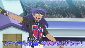 對戰開始,小智派出王牌皮卡丘,丹帝則派出閃焰王牌應戰。皮卡丘率先發動十萬伏特,但閃焰王牌展現了特性「自由者」,在使用「熱沙大地」時轉化為地面屬性,使電屬性攻擊無效化。面對屬性劣勢,小智果斷收回皮卡丘,改由耿鬼上場,而丹帝也隨即將閃焰王牌換下,派出千面避役。
