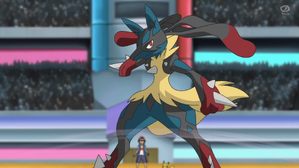 隨後,小智決定換下蔥遊兵,派出路卡利歐並立即進行「超級進化」。超級路卡利歐憑藉強大的波導感應,在踏冰人偶靈活的動作中精準捕捉其位置。儘管踏冰人偶試圖利用冰凍地面進行干擾,但超級路卡利歐最終以強力的招式擊敗踏冰人偶,為小智拿下了第二場勝利。丹帝對小智與寶可夢之間的牽絆表示讚賞,並隨即派出了多龍巴魯托。