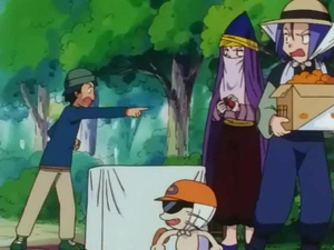火箭隊偽裝成占卜師,利用虛假的預言欺騙單純的亞斯吉,宣稱蚊香泳士被「邪氣」纏身,誘使亞斯吉將裝有蚊香泳士的精靈球交給他們進行「除厄儀式」。在亞斯吉閉眼讀秒時,火箭隊乘機搶走了精靈球並逃往山區。此時,小智等人才發現自己的寶可夢都還寄放在寶可夢中心,無法立即追擊,只得先趕回中心取回夥伴。