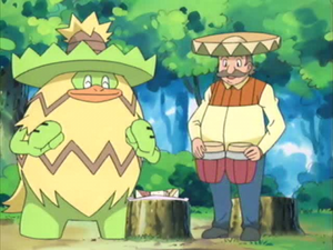 隨後,眾人被一陣歡快的鼓聲吸引,遇到了流浪藝人潘喬和他的搭檔樂天河童。潘喬提議以午餐三明治為賭注進行一場一對一的對戰。一心想證明自己的龍蝦小兵主動請戰,然而在對戰中,龍蝦小兵因為急於表現,戰鬥風格變得過於魯莽,與小智的指令配合也顯得混亂。反觀樂天河童隨著潘喬的鼓聲節奏優雅地移動,連續使用「守住」和「影子分身」戲弄龍蝦小兵,最後以強大的「破壞光線」徹底擊敗了龍蝦小兵。這場挫敗讓小智失去了午餐,也讓感到羞愧的龍蝦小兵獨自跑進了森林深處。