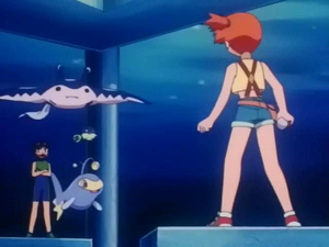 隨後開始了小霞與龍二的正式對戰。第一局小霞的角金魚不敵千針魚的連續攻擊而戰敗;第二局小霞派出太陽珊瑚,利用「自我再生」頑強恢復體力,最終反擊成功擊敗巨翅飛魚。就在戰況進入一比一平局時,火箭隊駕駛著新型的機械裝置強行闖入現場,利用強大的吸力抓走了在場所有的水屬性寶可夢,連同小霞與龍二也被困在機械中。混亂中,不會游泳的可達鴨也意外地被捲入捕獲艙內。